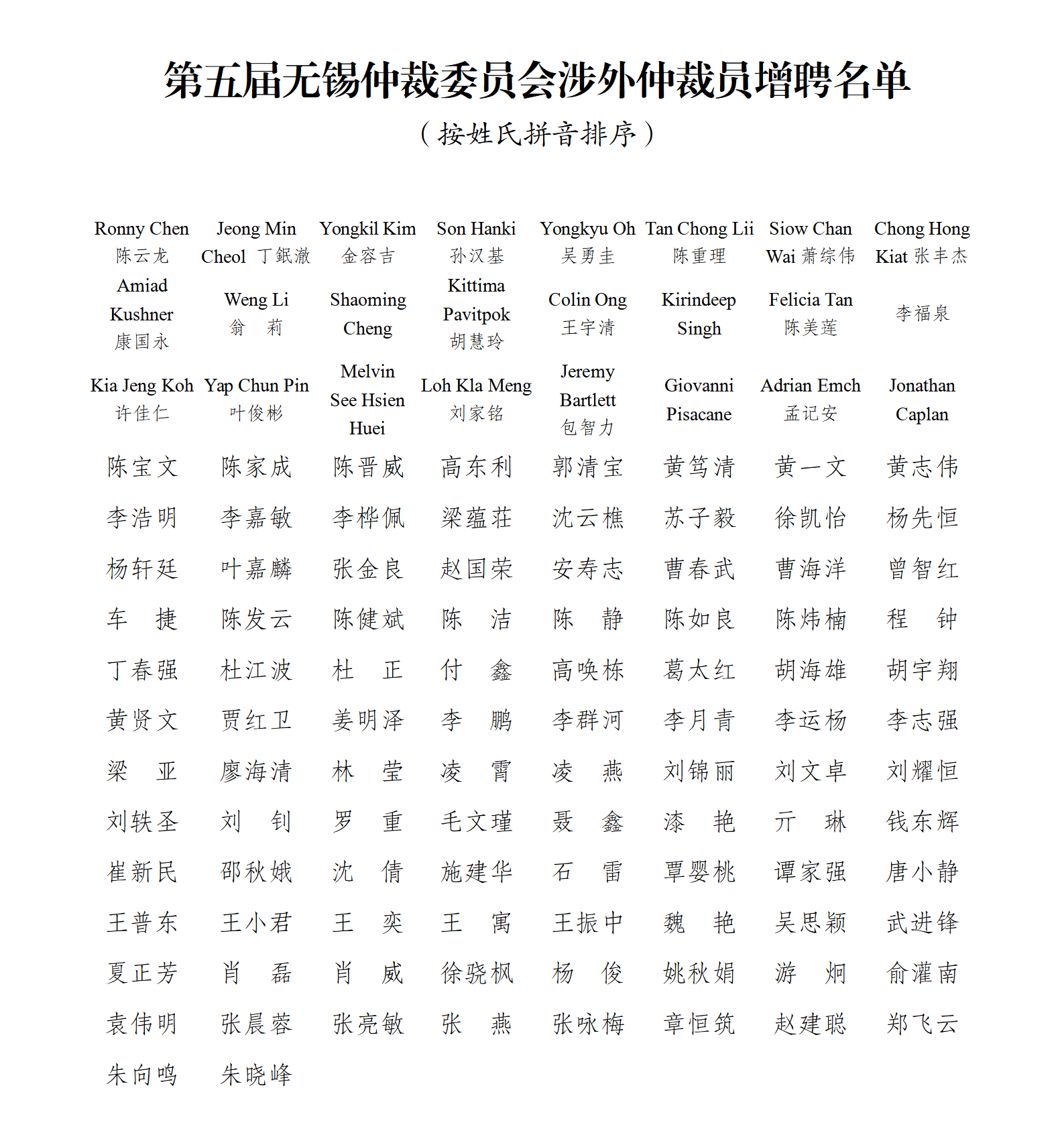 根据《中华人民共和国仲裁法》和《无锡仲裁委员会章程》的有关规定,经2025年10月10日第五届无锡仲裁委员会组成人员第三次会议审议通过,决定增聘Ronny Chen(中文名:陈云龙)等人士为第五届无锡仲裁委员会仲裁员,现予以公告(按姓名拼音顺序排序),聘期与第五届无锡仲裁委员会仲裁员任期相同。