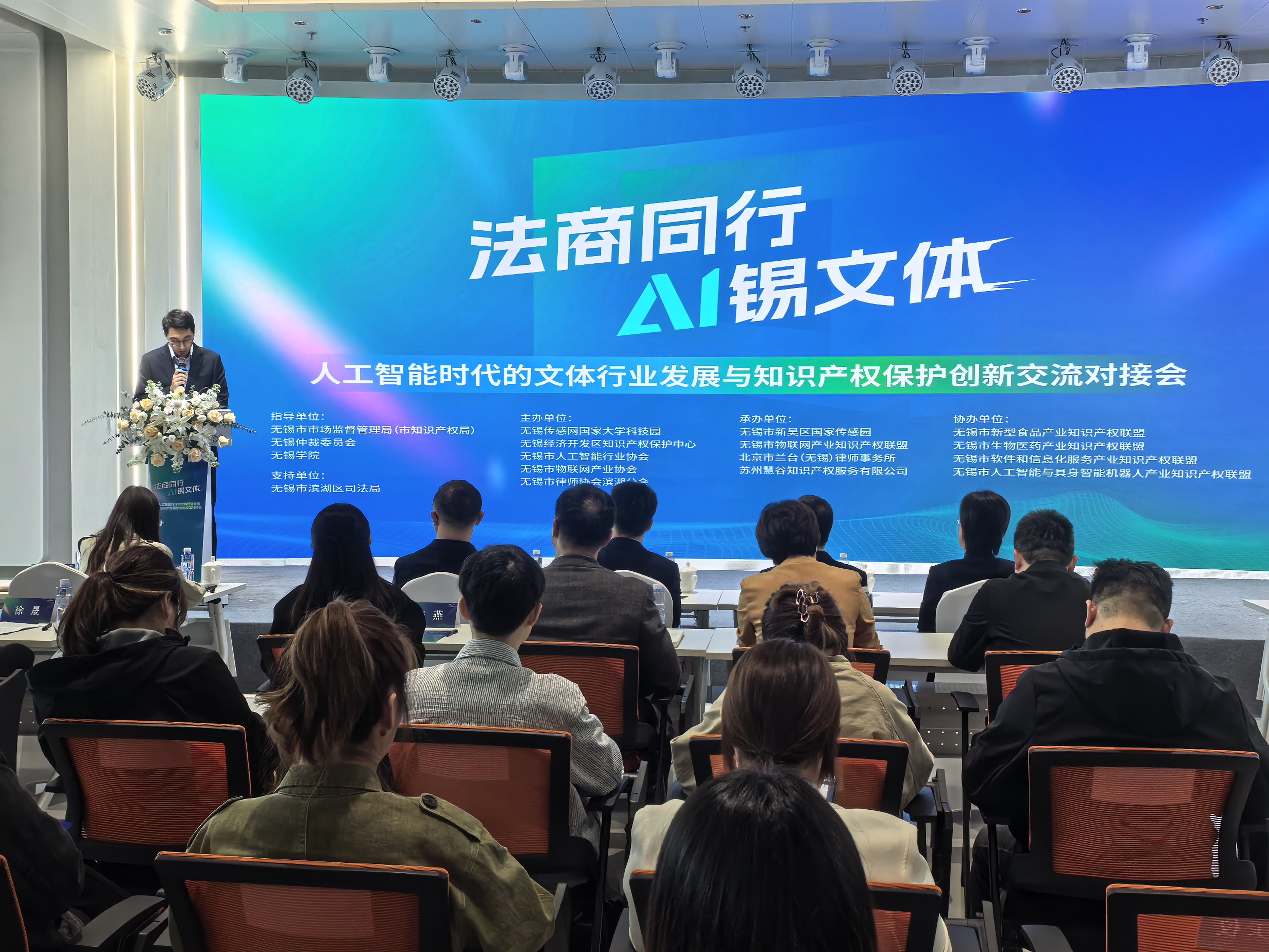 4月22日下午,值第26个世界知识产权日来临之际,“法商同行·AI锡文体——人工智能时代的文体行业发展与知识产权保护创新交流对接会”在无锡数字经济产业园成功举办。本次活动由无锡市市场监督管理局(市知识产权局)、无锡仲裁委员会指导,无锡市人工智能行业协会、无锡市物联网产业协会、无锡市物联网产业知识产权联盟主办,汇聚了政府部门、高校院校、行业协会、律所及企业代表约60人,共同探讨人工智能与文体产业融合背景下的知识产权保护新路径。